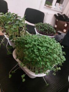 A rendezvényre elhoztak néhány mintanövényt is, így a résztvevők végigkóstolhatták a borsó, retek, póréhagyma vagy éppen karalábé magokból nevelt mikrozöldeket. Személyes élményem, hogy az ízvilág nagyon intenzív, szemet lecsukva teljesen az az illúzió, mintha a kifejlett termést fogyasztanám. Volt a választékban pikánsabb és lágyabb ízű növény is, biztos, hogy mindenki megtalálja a kedvére valót, de nekem az összes nagyon ízlett. Mindenképp érdemes kipróbálni!
