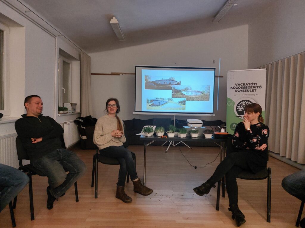 A rendezvény második felében egy másik nagyon izgalmas téma került elő: a földházak és dombházak. Ezek az épületek a modern, fenntartható építészet remekművei. Zoli és Rebeka maguk is ilyen otthont építettek Vácrátóton, és éppen beköltözés előtt állnak. A beszélgetésben részt vett még Reppert Béla, településünk új főépítésze is, aki szintén ilyen zöld házat épített. Az épületek sajátosságai, hogy a falakat kívülről földdel borítják be, amelyre zöld növényeket telepítenek. Akár a háztetőt is be lehet fedni földréteggel, amelyen megtelepednek a szárazságtűrő növények is, így rövid idő alatt önfenntartóvá válik, öntözést sem igényel. A megoldás előnye, hogy automatikusan klimatizál: nyáron hűt, télen fűt, így sokkal kisebb energiaköltséggel lehet élhető, kellemes hőmérsékletet elérni, klímaberendezésre sincs szükség. A zöldfelület pedig visszaadja a természetnek azt a területet, amit az ember a lakhatás miatt kiszakított belőle.